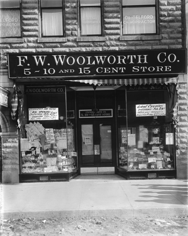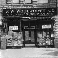 - F.W. Woolworth; Exterior, showing details of displays and the front door..