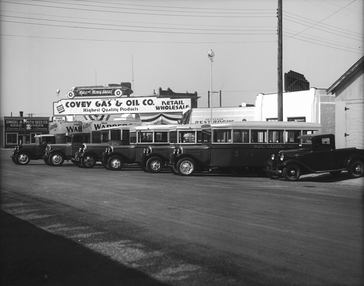 - Seven Warberg Transfer Company trucks parked below a large sign for Covey Gas and Oil Company.