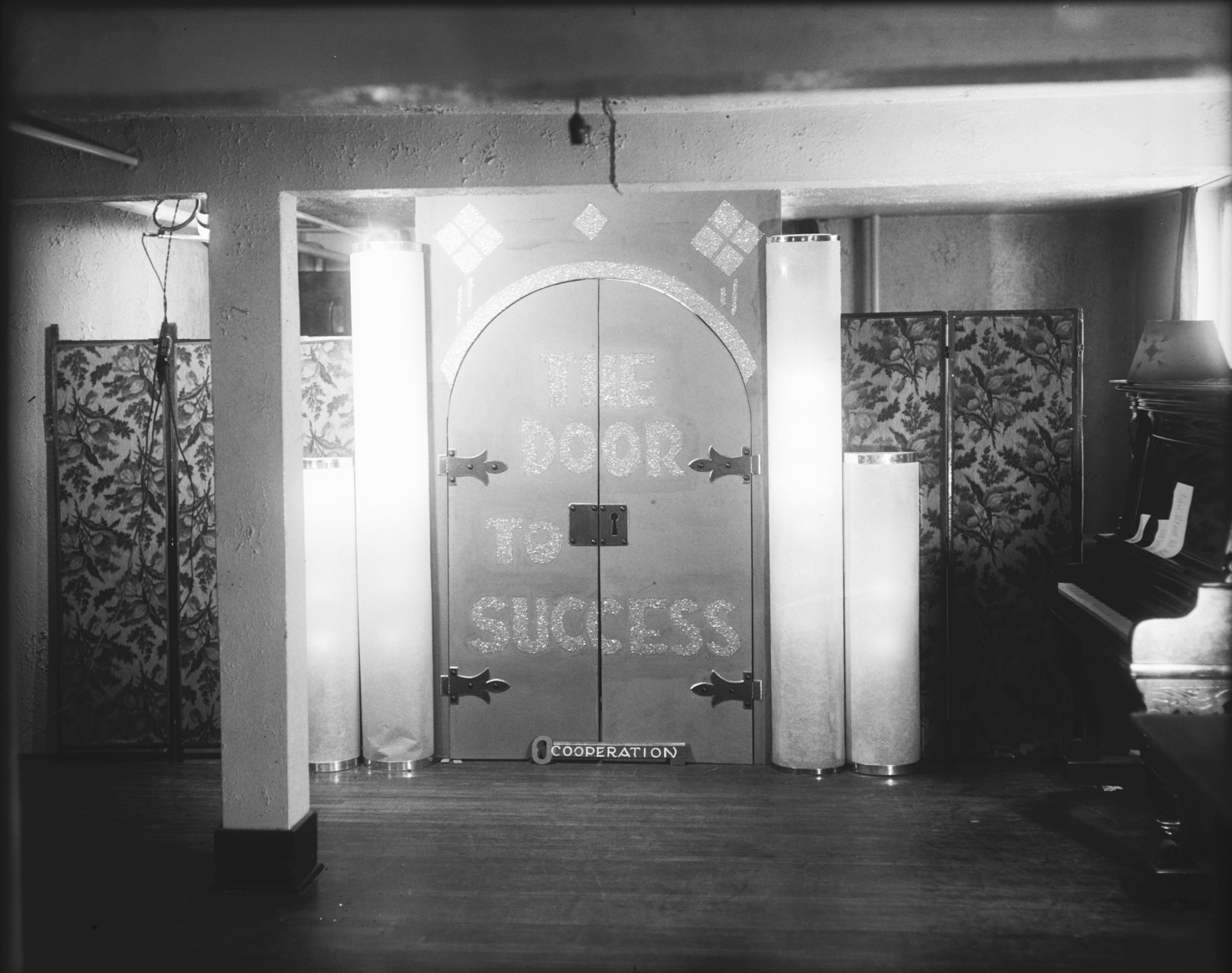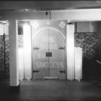 - A set for an amateur theatrical, with double doors labeled, The Door to Success.