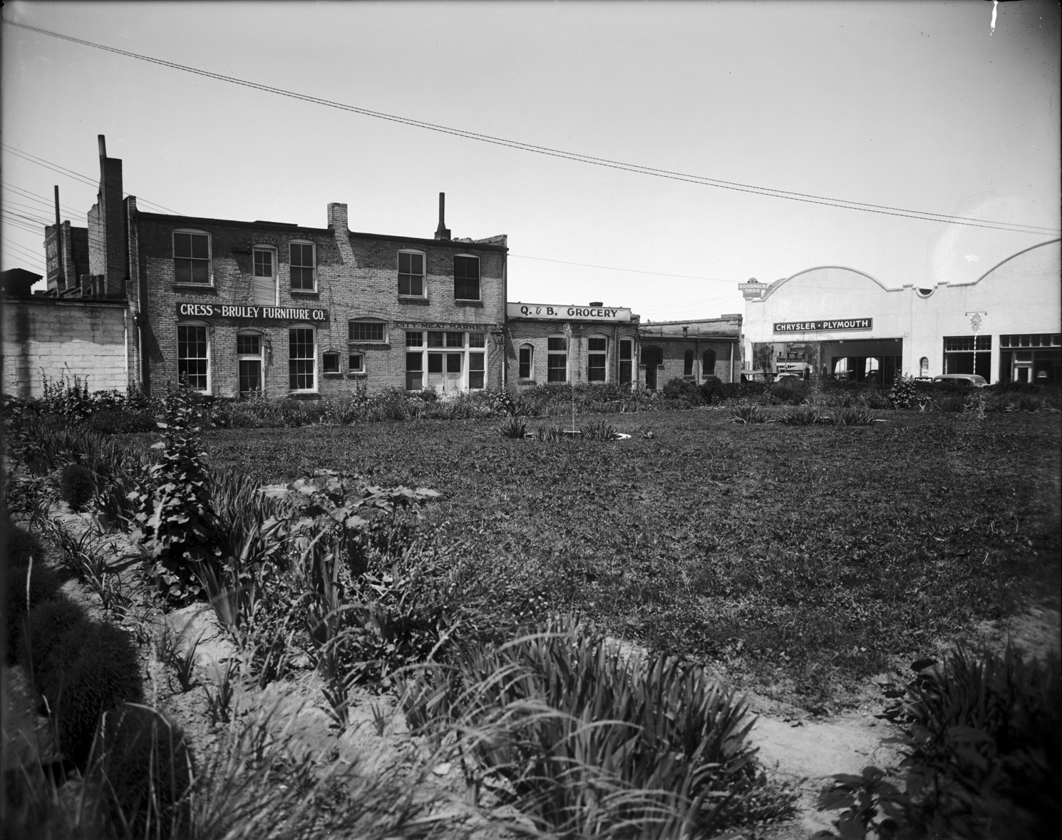 - Cress & Bruley Furniture Co.; from the back, across the Bisbee garden; rear of O & B Grocery, City Market, and Bisbee Studio, view of Chrysler Plymouth dealership across 2nd Ave E also visible.