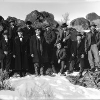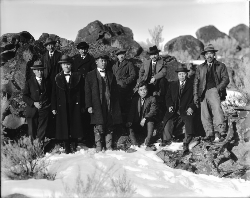 - A group of Japanese men posed among lava rocks and snow in a canyon area. First row: first from left is Eddie Tanaka; second from left with shawl collar is Ray Tanaka or Tom Koto, Sr; first from right is Kaichi Shiozawa.