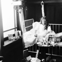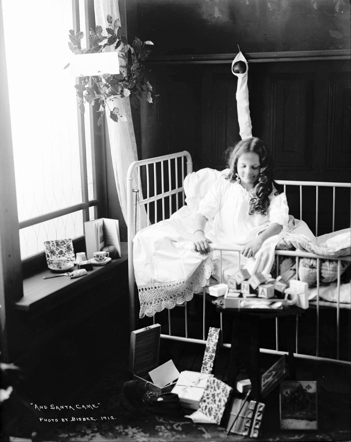 - "And Santa Came"; a child (girl) sitting in a crib. Christmas Theme Photoshoot