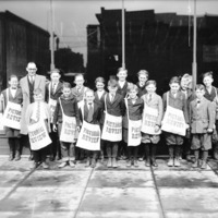 - A group of newsboys posed in front of a building, with bags marked Pictorial Review.