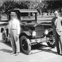 - Union Central Life Insurance sign on a windshield of a Ford automobile; two men standing nearby.