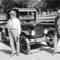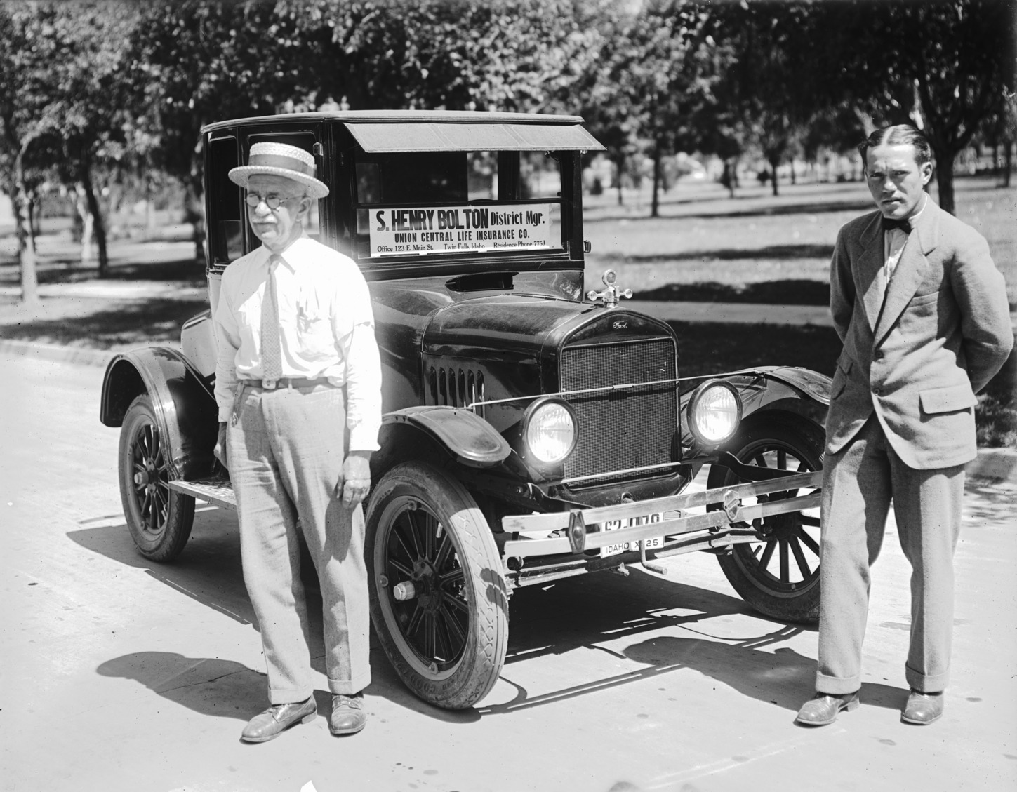 - Union Central Life Insurance; sign on a windshield of a Ford automobile; two men standing nearby.