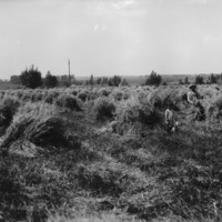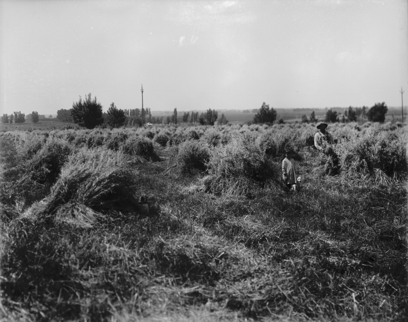 - Oats; A man and child and dog in a field.