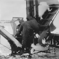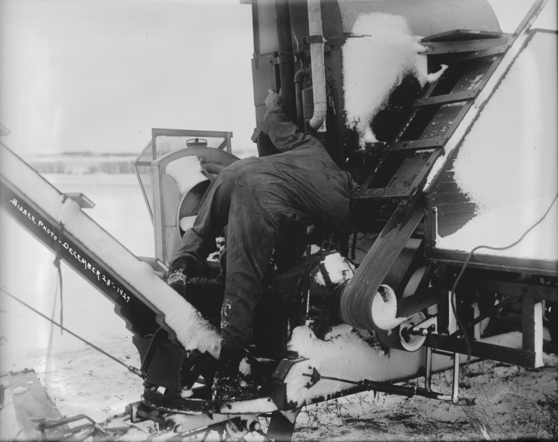 Threshing Machinery, December 28, 1927; a man atop a thresher.