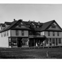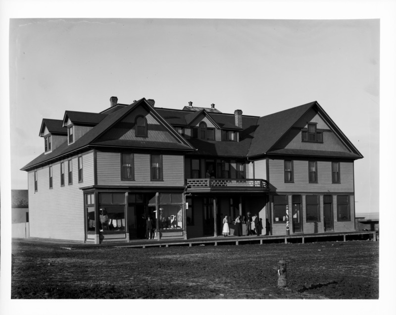 - A two-story hotel in Buhl, Idaho, with people on the porches.