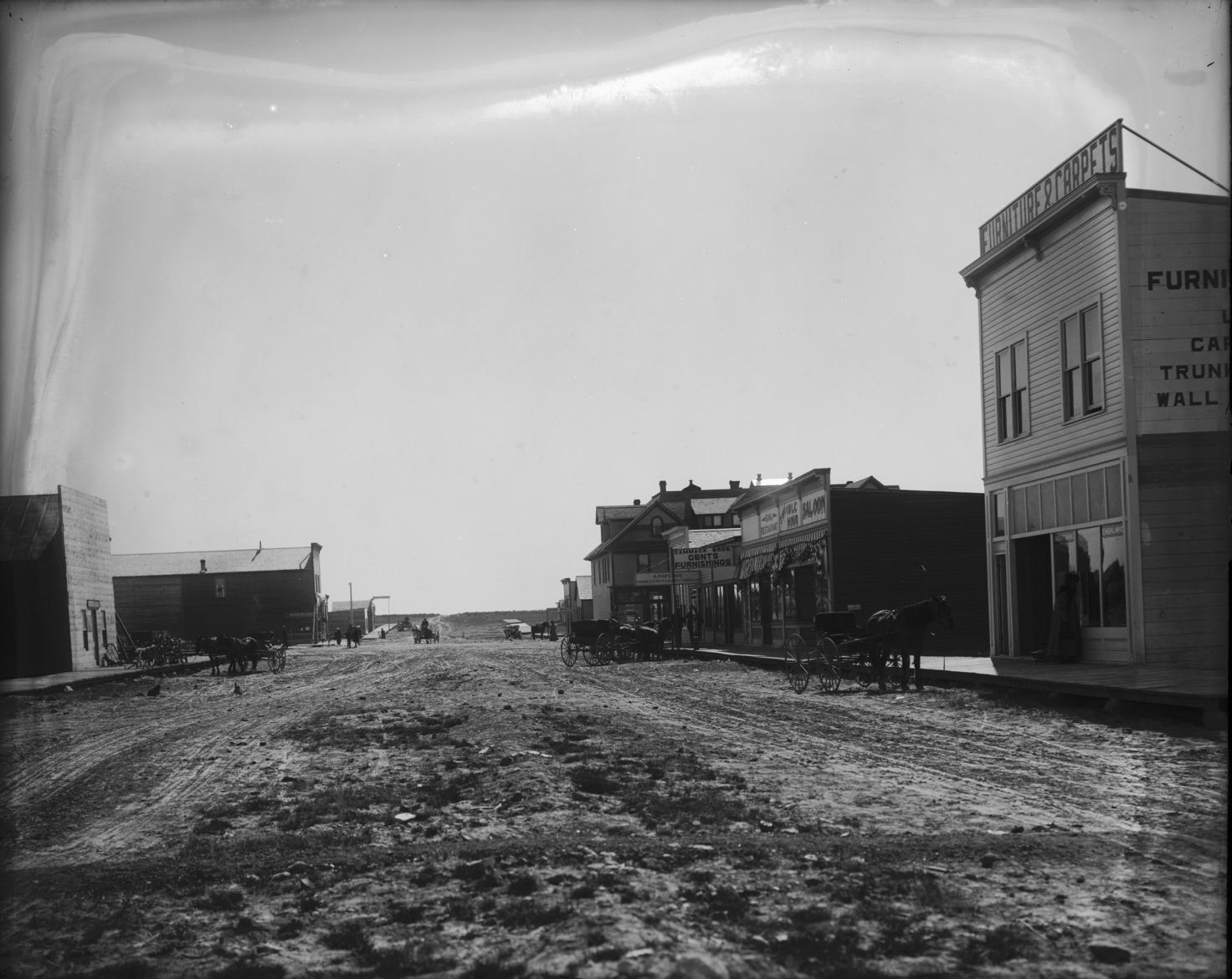 - A muddy street through downtown Buhl, Idaho. Visible business signs include "Idaho Realty: Twin Falls Investment Co.;" "A. Popenoe: Candies, Fruit, Cigars, and Tobacco;" "Cammack Bros: Gents Furnishings;" "Buhl Restaurant;" "The Idle Hour Saloon;" "Furnishings and Carpet;" "Undertaking, Embalming"