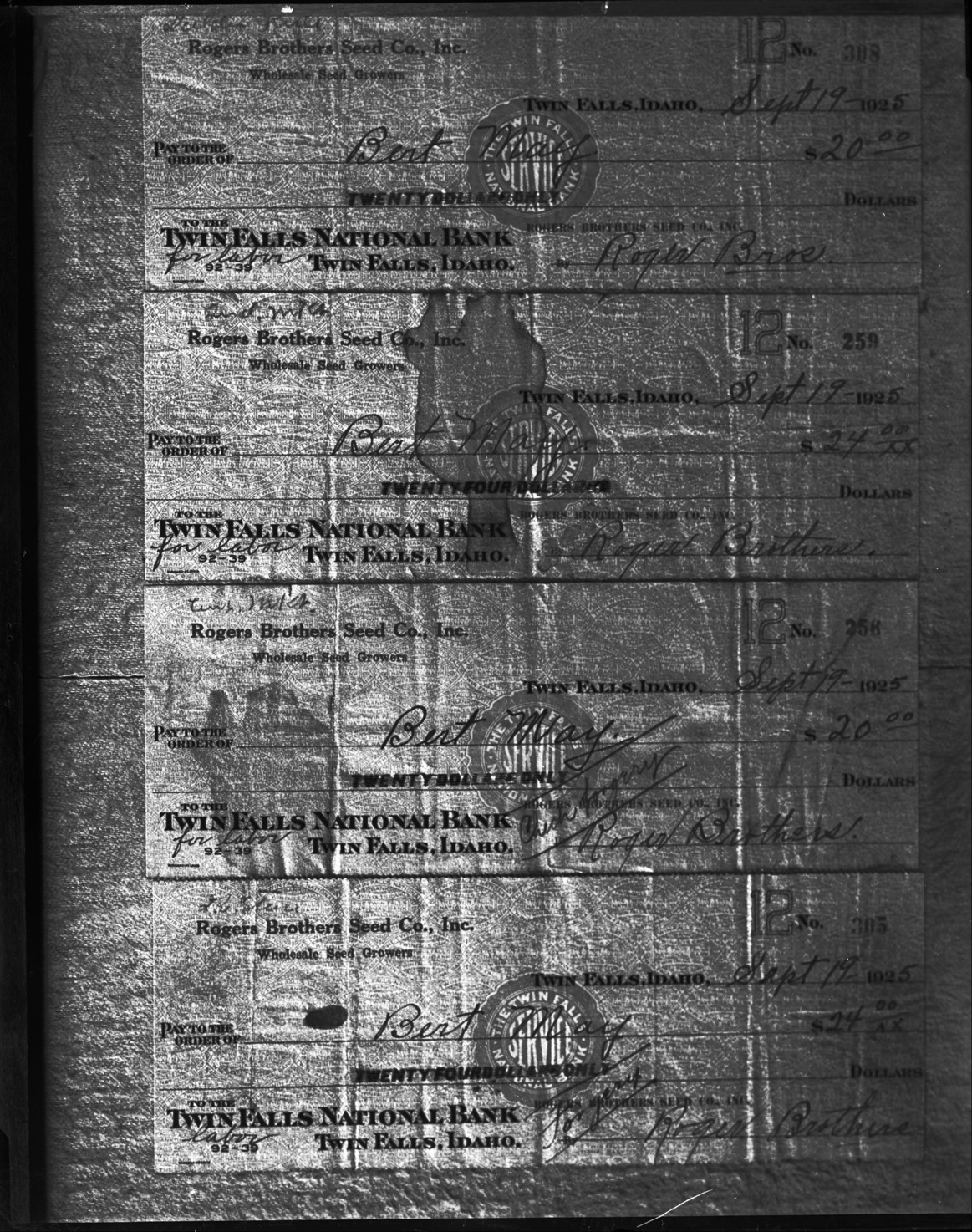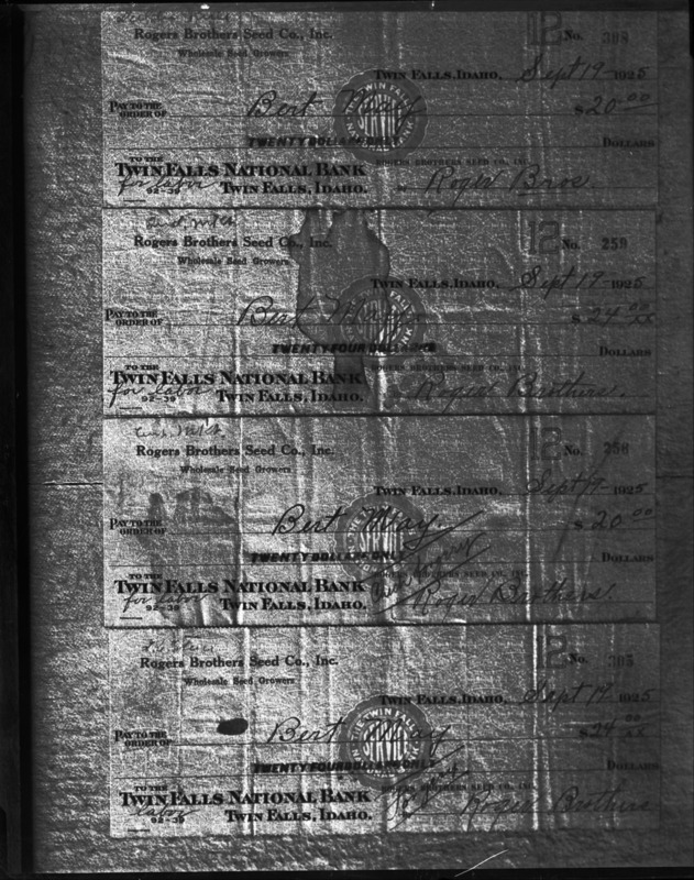 - Four bank checks to Bert May from Rogers Brothers Seed Co., Inc.; written on Twin Falls National Bank.