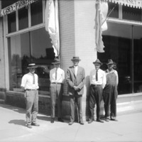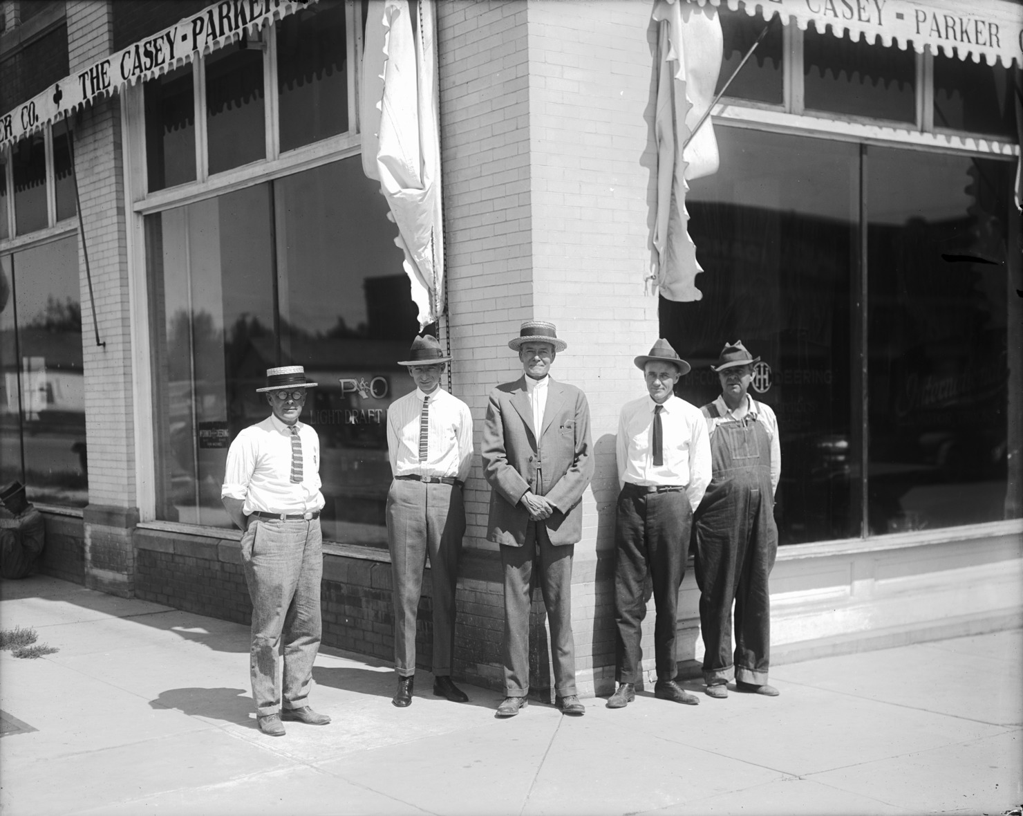 - A group of five men in front of the Casey-Parker building. {Originally built as the Masonic Temple in 1909.}