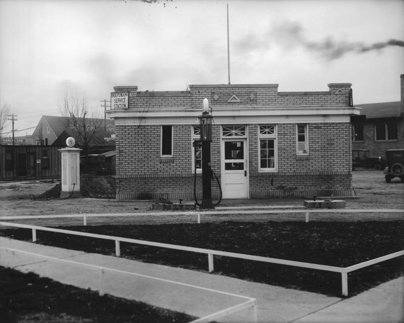 - Independent Service Station; a small, brick building.