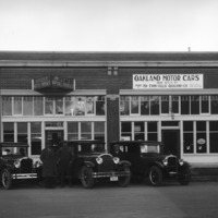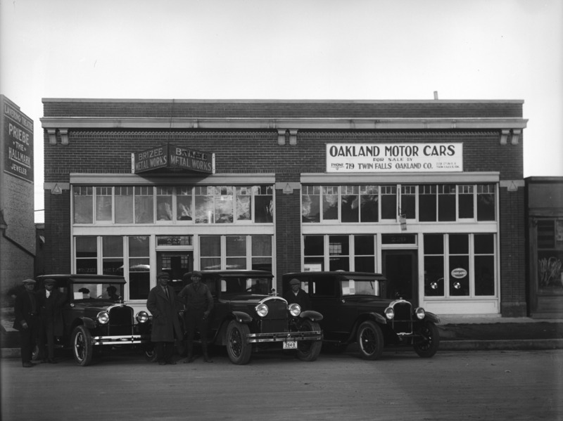 - Three automobiles (cars) parked in front of the Oakland Motor Cars and Brizee Metal Works building. Sign on the Lavering Theatre next door also advertises "Priebe: The Hallmark Jeweler"