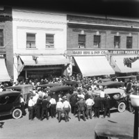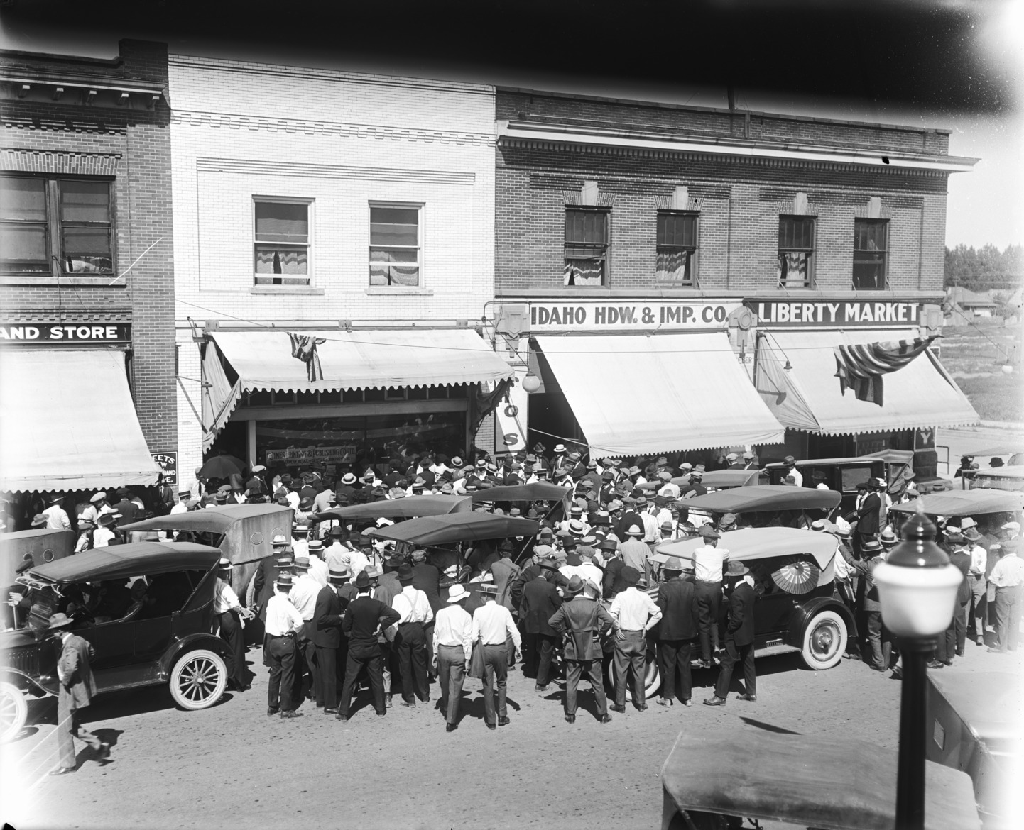 - Times Printing and Publishing Company, Idaho Hardware and Implement Company, and the Liberty Market; a large crowd of people and automobiles in the street in front of the buildings.
