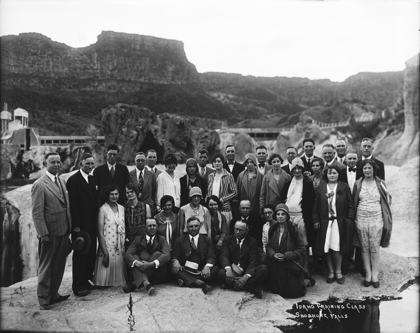 - "Idaho Training Class, Shoshone Falls;" group of men and women, posed at the falls.