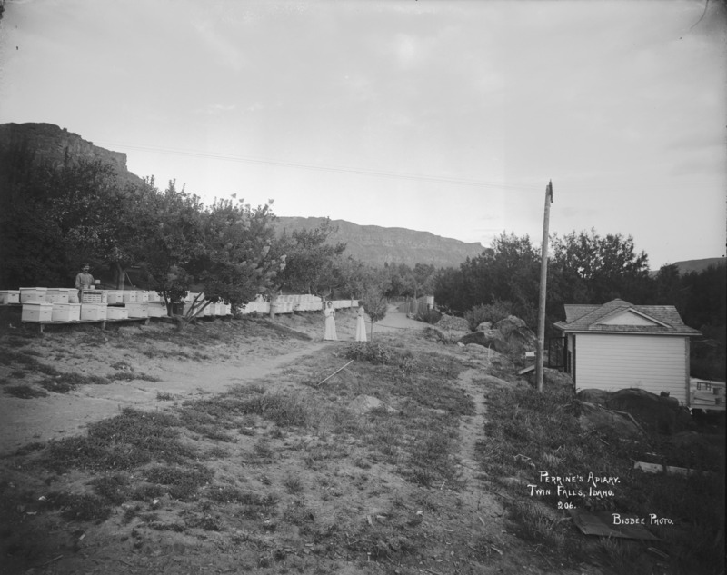 - "Perrine's Apiary. Twin Falls, Idaho;" I.B. Perrine on left, Mrs. Perrine, and Mrs. Morgan Heap on right, are pictured among the bee hives. (Names from Twin Falls Times-News, 23 March 1975)