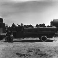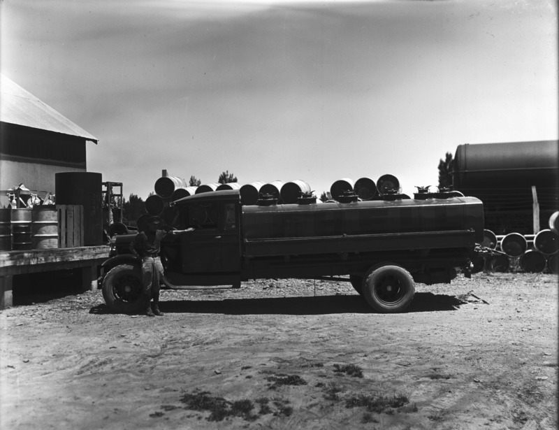 - Gasoline delivery truck, with a man posing alongside.