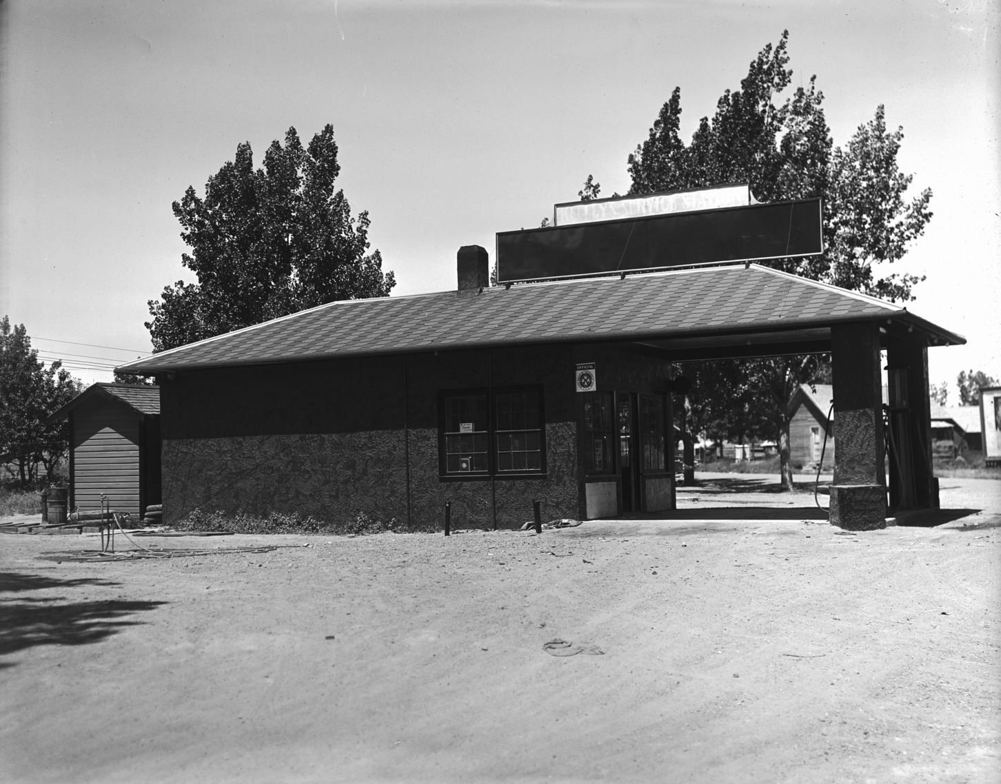 - Gas or Service Station; faded sign on top of building reads "Kelley's Service Station;"