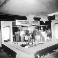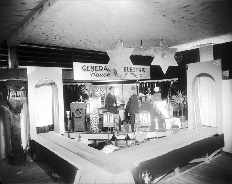 - A General Electric display of electric applicances. Two men converse amidst display. Sign reads General Electric House of Magic.