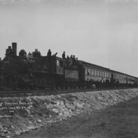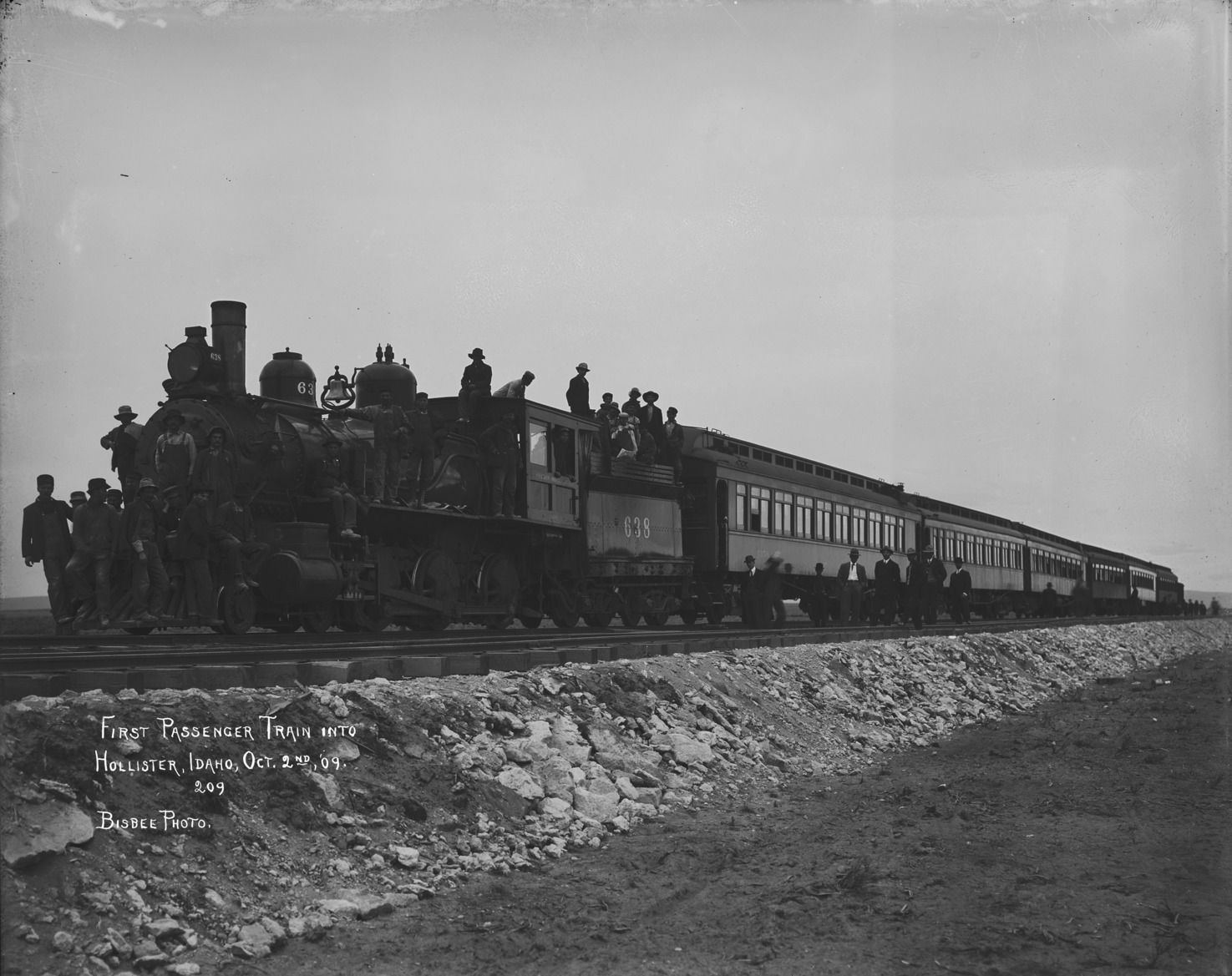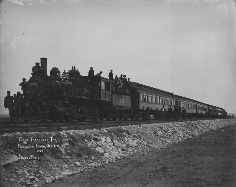 - "First Passenger Train into Hollister, Idaho, October 2nd, 1909;" train with an engine and six passenger cars sitting on the railroad tracks; people in front of and on top of the train and on the tracks.