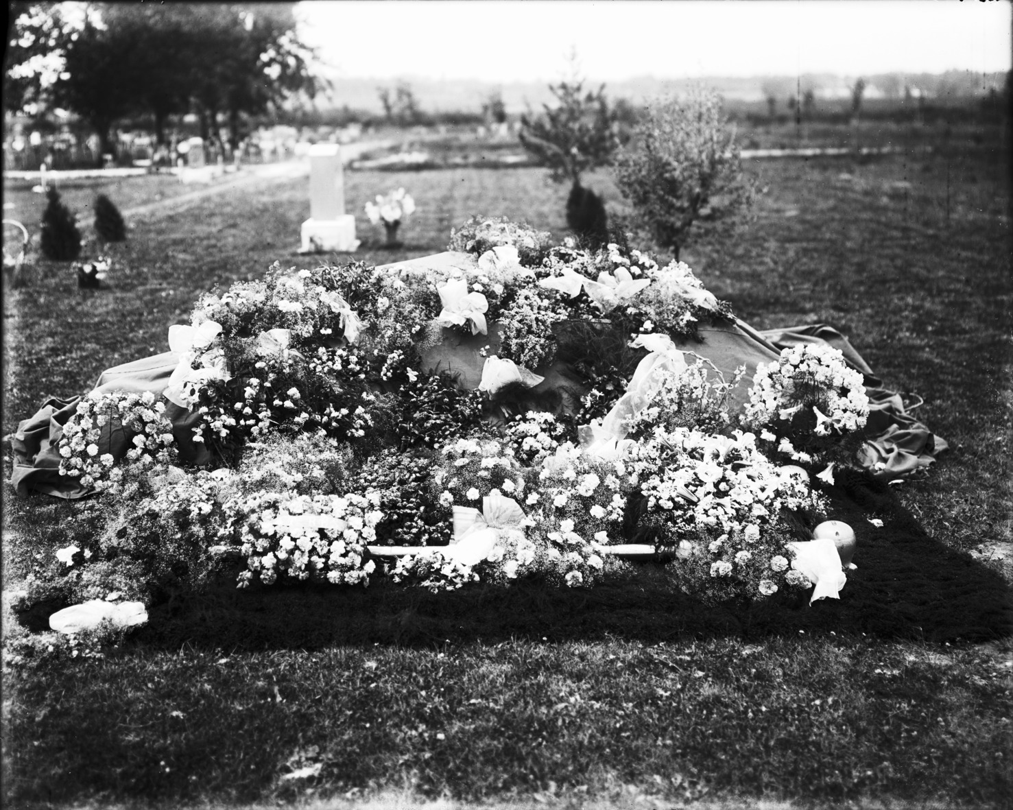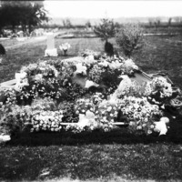 - A casket covered in flowers in a cemetery.
