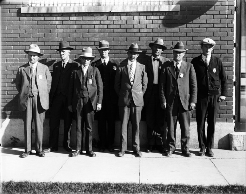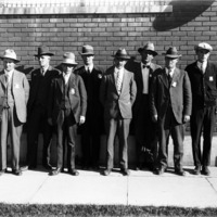 - A group of men, posed outside a brick building. Most are wearing badges, perhaps police or fire.