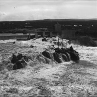 - "American Falls Power Plant;" view from across falls at smaller building and dam.