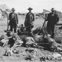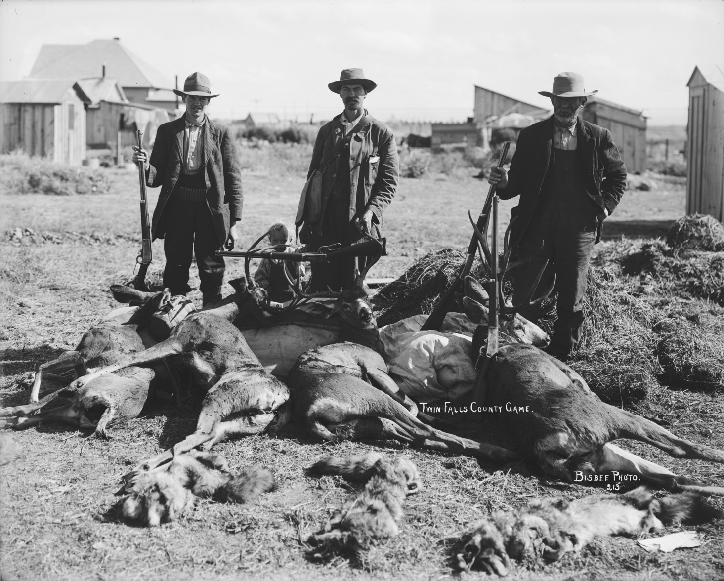 - "Twin Falls County Game;" Three men with guns, among buildings with haul of rabbits and deer