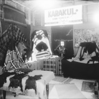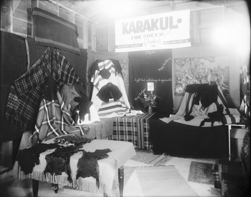 - A display of woolen goods. Sign reads "Karakul Fur Sheep Products; Snake River Karakul; Association, Twin Falls, Idaho;"