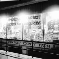 Lighted display featuring crackers and biscuits at American Market Meats and Groceries; office below is the Twin Falls County Farm Bureau.