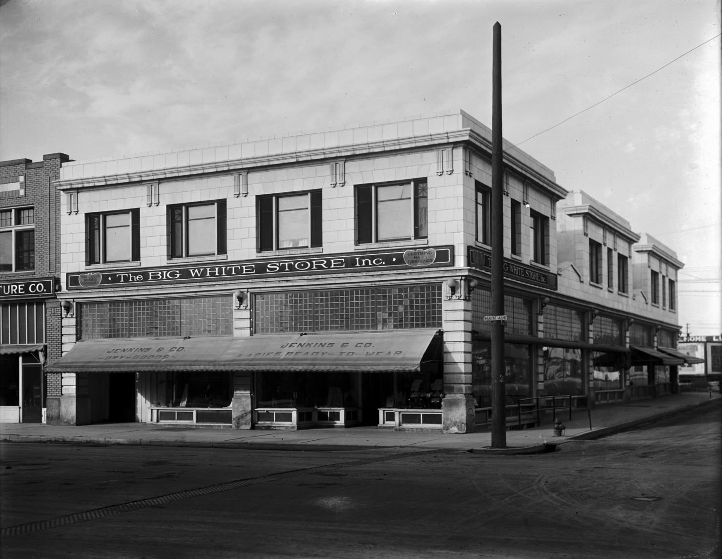 - Corner view of the Big White Store; next door is the Hoosier Furniture Co. Awnings advertise Jenkins and Co. dry goods and ladies ready-to-wear