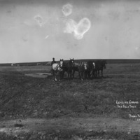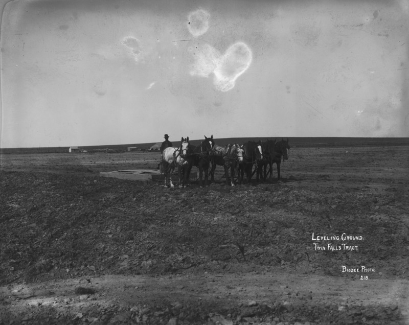 "Leveling Ground. Twin Falls Tract;" man with a six-horse team, operating a leveler on plowed ground.