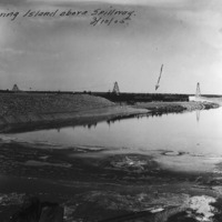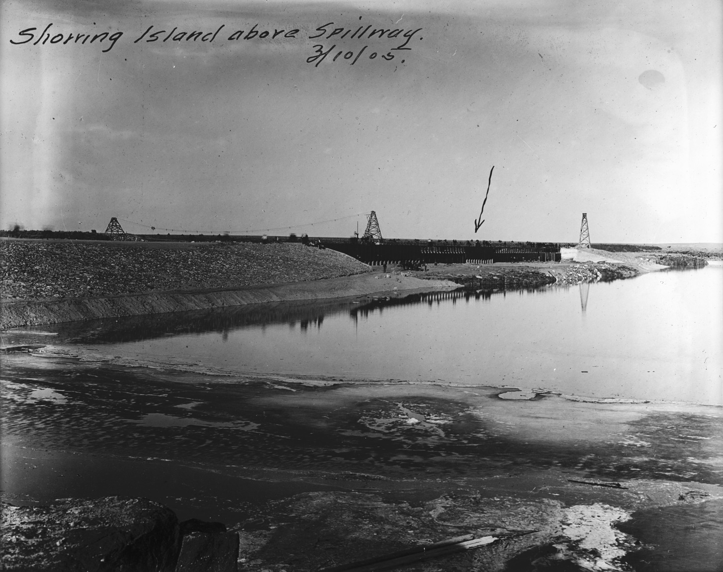 - "Showing island spillway, 3/10/05;" at Milner Dam, March 10, 1905