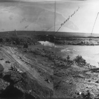 - Two photos spliced together showing Milner Dam; tunnel outlet pointed out.