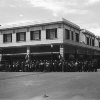 The Big White Store, looking south on the corner of Main St S and 2nd St S (now Hansen St S); with a large crowd of children on the sidewalk in front of the building. A sign on the 2nd St S side of the building reads "Nu-Way Grocery;" also visible is a sign for Hotel Reed; Hoosier Furniture Store is on very left.