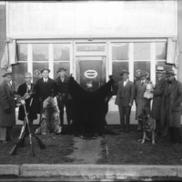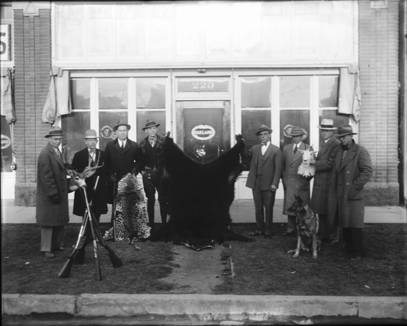 - Eight men with hunting trophies, standing before the Oakland Motors storefront. Pontiac emblem also visible.