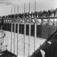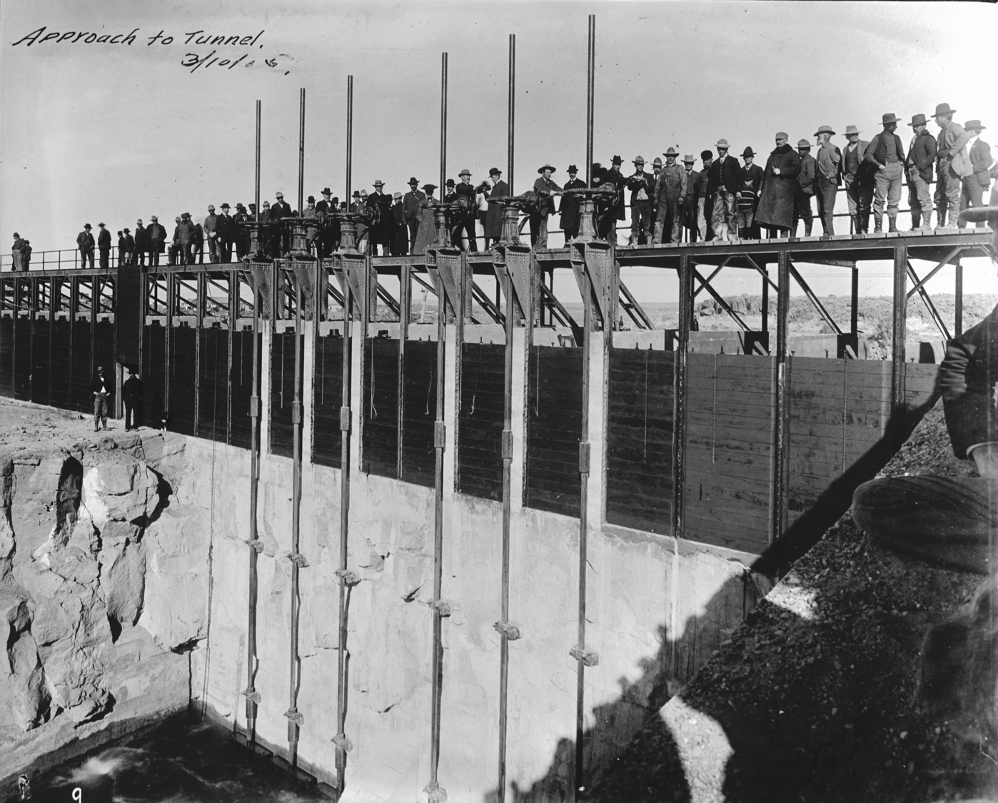 - "Approach to tunnel. 3/10/05;" large group lines the Milner Dam, March 10, 1905.