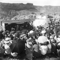 - A large group of people at Shoshone Falls, listening to Ezra Meeker speak on Flag Day, 17 June 1910. Meeker, other dignitaries, and an orchestra sit beneath a covered platform.