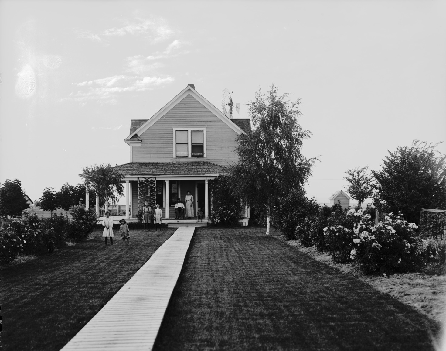 - A two-story frame house, with a manicured lawn and landscaping. A family of seven is posed on the porch and lawn. An outhouse is visible in background on left.