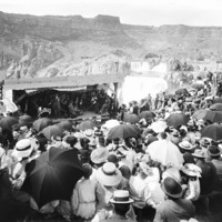 - A large group of people at Shoshone Falls, listening to a speaker on Flag Day, 17 June 1910. Ezra Meeker, other dignitaries, and an orchestra sit beneath a covered platform.