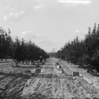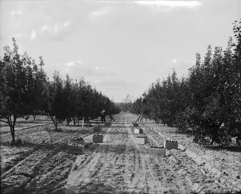- Four men, three on ladders, picking apples in an orchard. Several boxes full of apples sit alongside rows of trees.