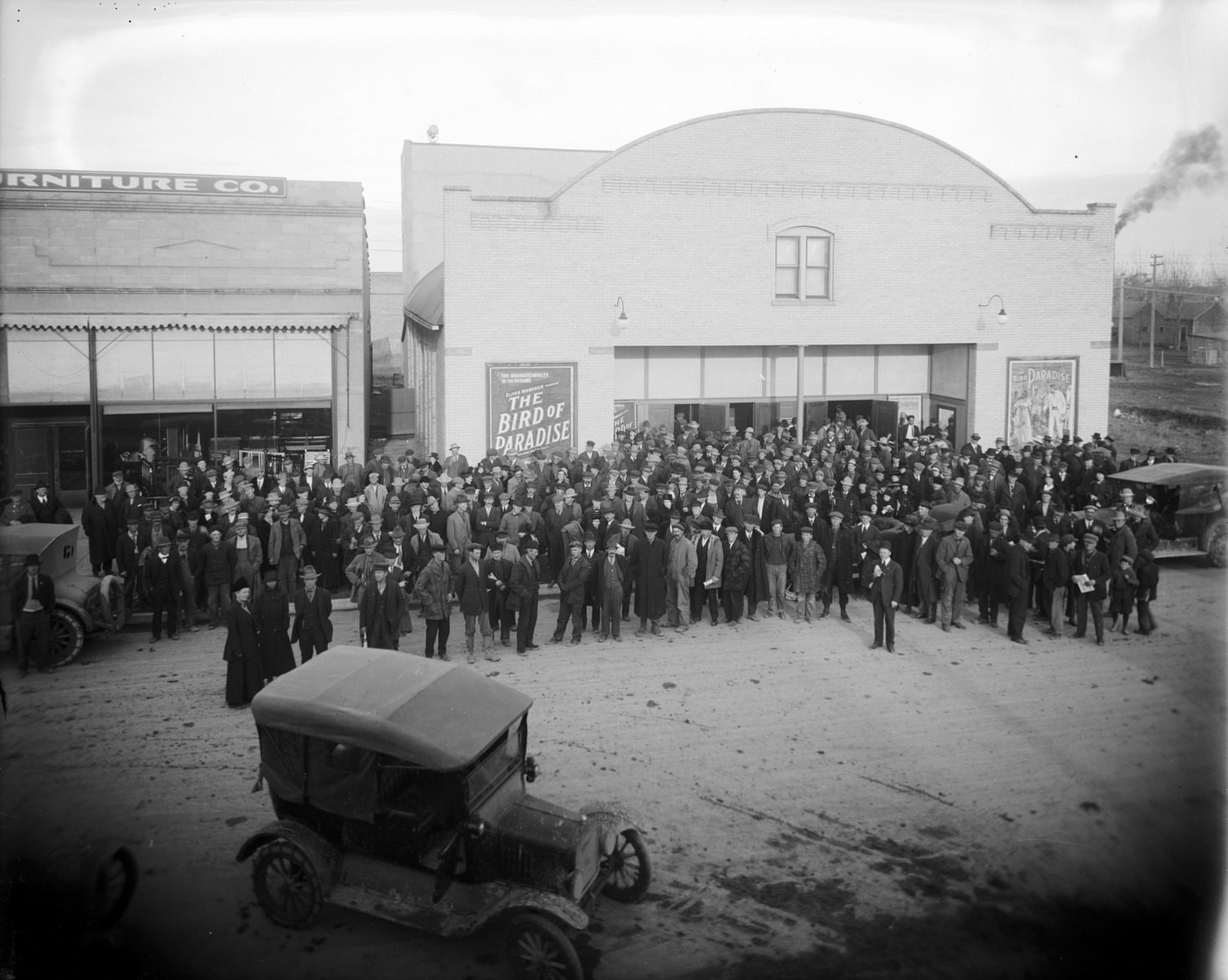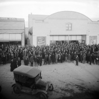 - A large group of men and women gathered in front of the Lavering Theater. The group may have been listening to a talk by A.C. Townley, a nationally known politician who was scheduled to talk at the Lavering on 17 January 1918. Lavering Furniture Store on left.