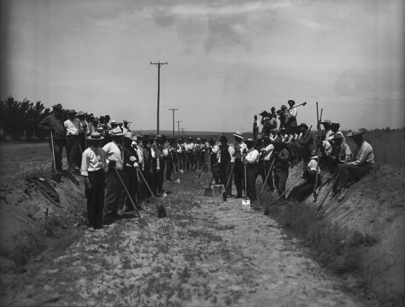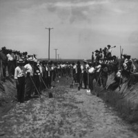 - Men, some in dress clothes, standing with shovels in hand, on an unfinished railroad bed. They are helping to finish the electric car line.