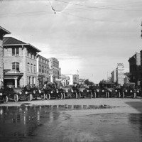 Ten Buick automobiles with riders and drivers park across Main Street in front of the Perrine Hotel. Businesses seen: Rexall Drug Store, Hatter, Ladies and Gents Shine, Alco Clothes Shop, The Jewel, Grocery, Hickler's Cash Store, Varney Candy, Cafe, Independent Meat Market, The 5 and 10 Cent Variety Store, Light and Power, Roberts-Daly Company Bowling, Cotillion Hall, Drugs, Kingsbury Printing Company