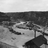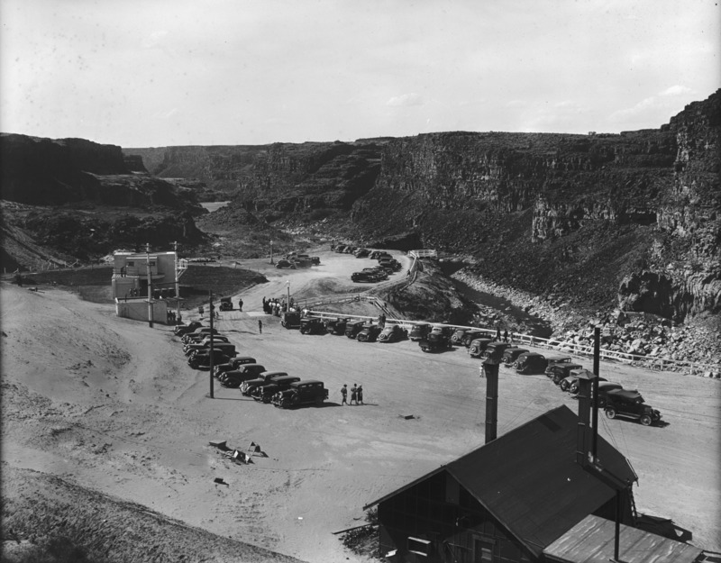 - Automobiles line the edge of the canyon at Twin Falls (waterfall) for the exhibition of Idaho Power's House of Today, a model home featuring new technologies that will become the home of the power plant's superintendent.