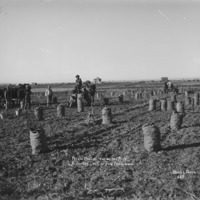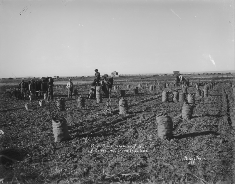 "Potato Digging, 430 bushels per acre. L.A. Snyder, 1 mile east of Twin Falls, Idaho;" Seven men, with horses, in a field of bagged potatoes.
