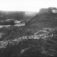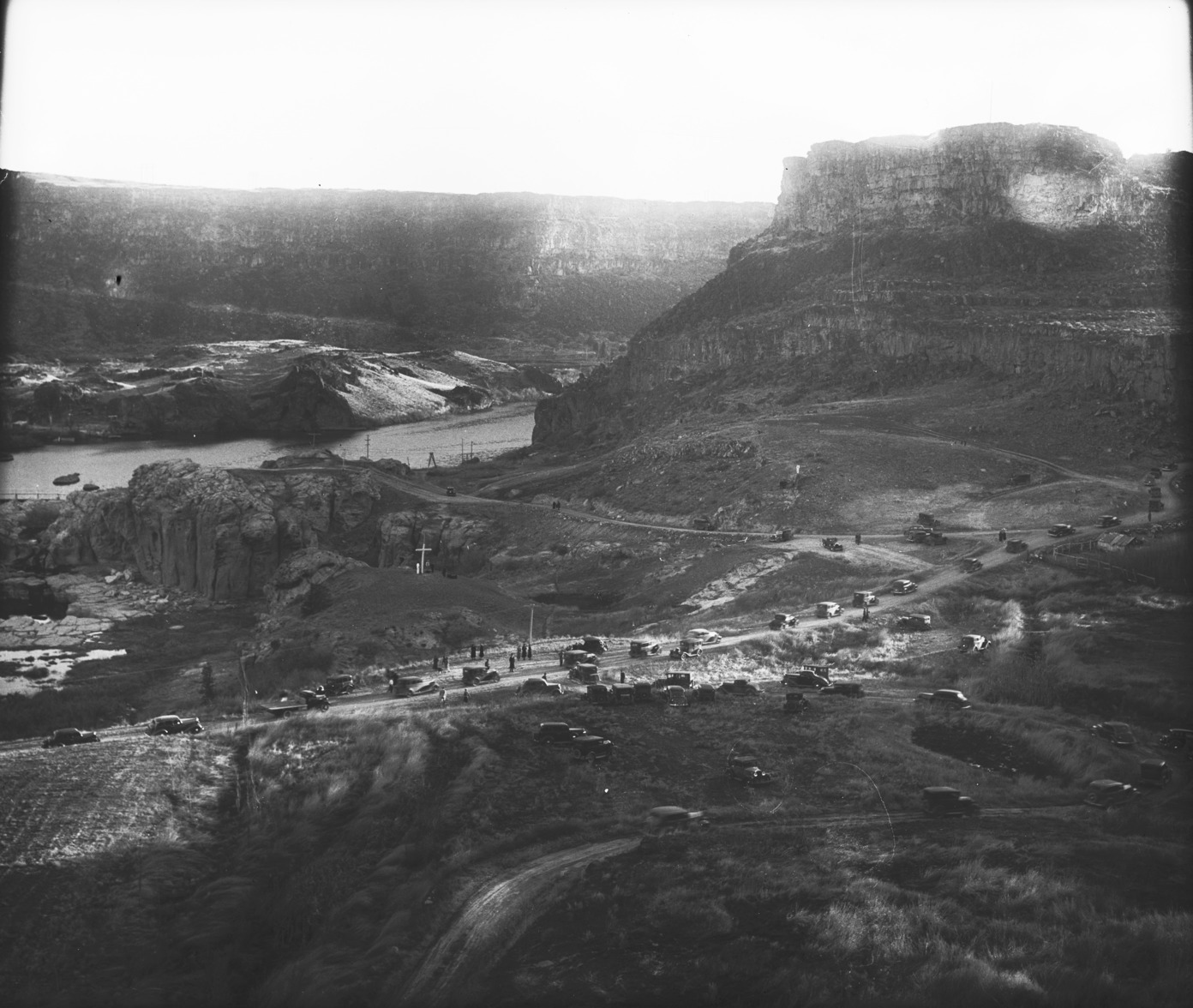 - Wide view of automobiles on the road at Shoshone Falls in the Snake River Canyon. Several people stand under a large cross that has been erected.