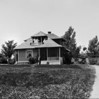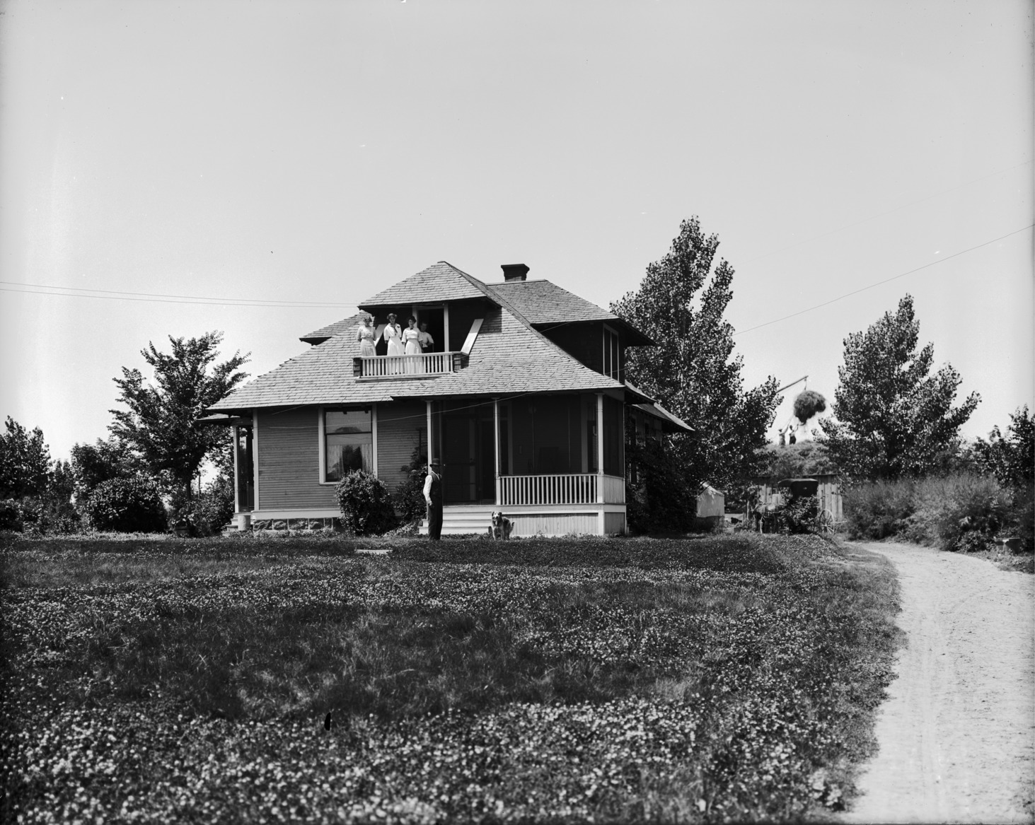- The William Cheek Home on Blue Lakes Blvd. Four women at stand at dormer window balcony, a man and dog in front of the porch. Men stacking hay using a derrick in background. A horse and buggy and an outbuilding also visible in background.