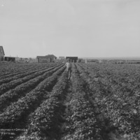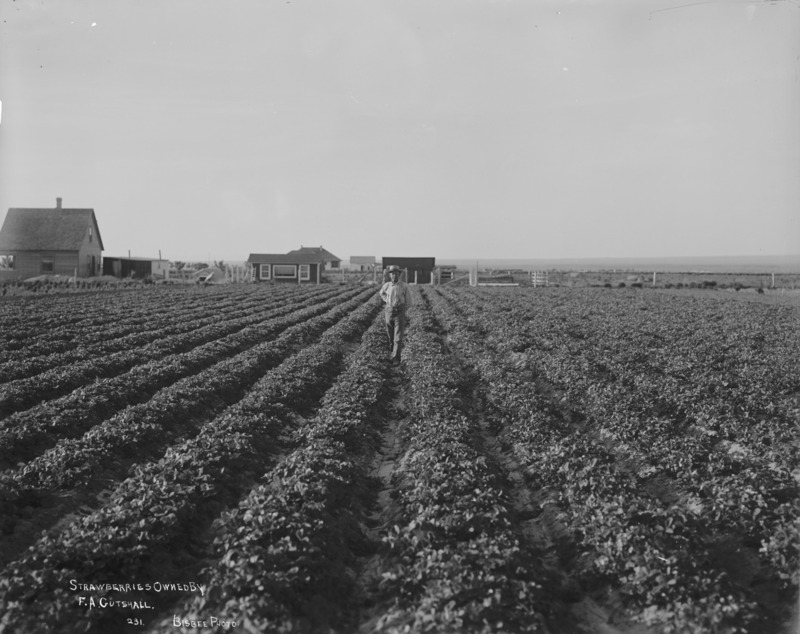 - "Strawberries Owned by F.A. Gutshall;" Man standing in a berry patch, house and farm buildings in the background.