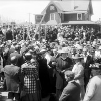 A large group of people gathered at a construction site, most likely when the cornerstone for the new Presbyterian Church was laid in May 1917. The house in the background is the Babcock House, which was sold to the Presbyterians when they purchased the corner lot next it. The house was used as the Presbyterian Manse until; 1952, when it was moved to the corner lot at 204 Harrison St.